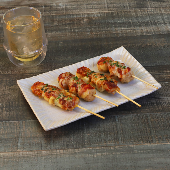 市販の焼き鳥の串にピザーラピザトーストソースとチーズで焼くだけで簡単おいしいメニューです。