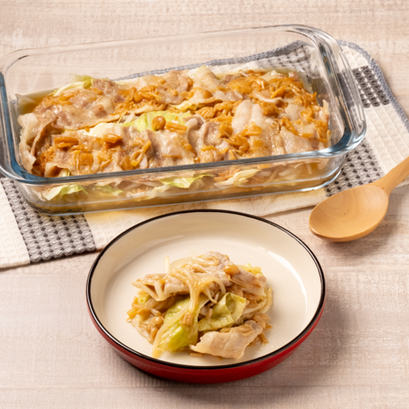 | 1 | 耐熱容器に、もやし→キャベツ→豚バラ肉→Aの順に、ミルフィーユ状に重ね入れる。 |