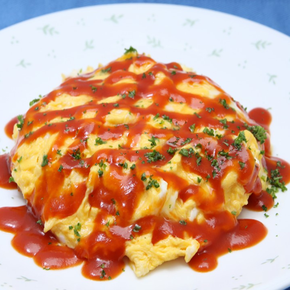 | [3] | 卵の表面がとろとろ状になったら、火を止め、[1]の上にかぶせ、オムライス好きのケチャップを格子状にかけパセリをふる。 |
