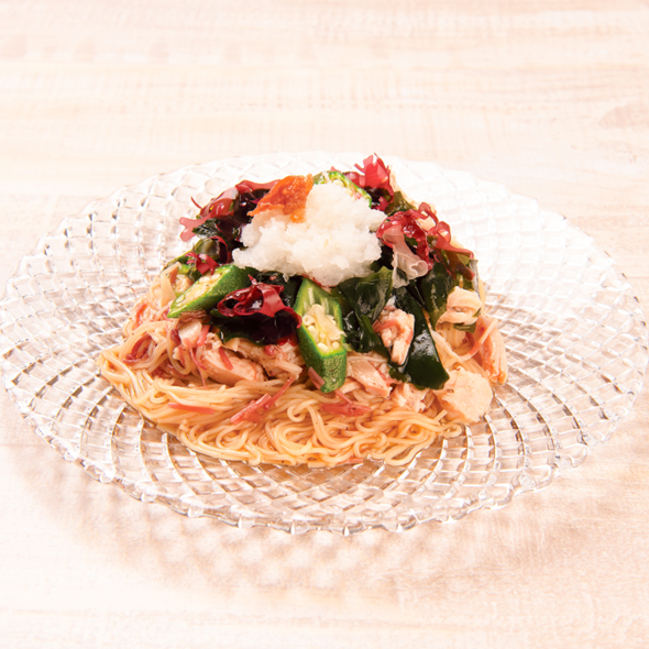 | 1 | そうめんは表示通りにゆで、冷水で冷ます。オクラはそうめんと一緒にゆでておく。 |